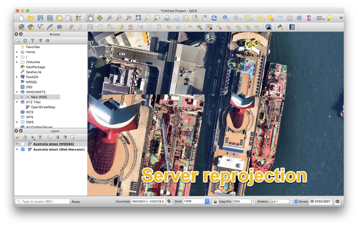 When the server doesn’t support the requested CRS, it will use the default CRS, which is WGS84 (EPSG:4326). This is where things get interesting. WGS84 (both the geographic version and its close cousin Web Mercator) are the two most popular projections for delivering content over the internet, and neither is specific about which datum the data is based on. This leaves the onus of selecting a datum and communicating that to the user to the service provider. It’s common in Australia to create datasets in GDA94 and convert them to WGS84 for presentation on the web with no datum shift. Using the same approach, one can convert GDA2020 datasets to WGS84. If you then open the two datasets side by side, you will notice the GDA94/GDA2020 offset, even though they may be using the same CRS.